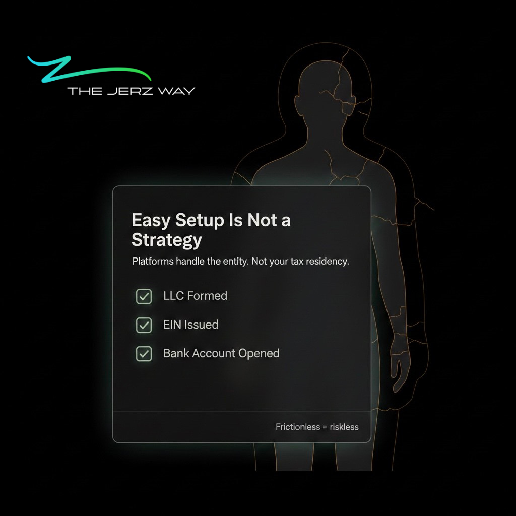 This ease of use is a feature, not a strategy. These platforms solve the technical steps of creating a business entity. They do not solve for your personal tax residency.